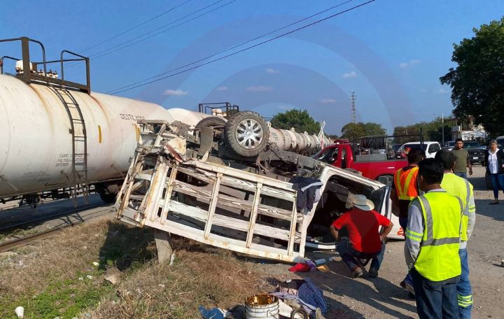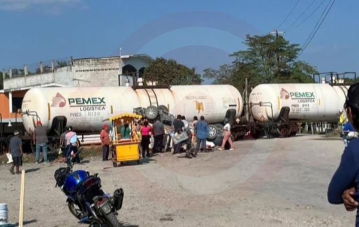 Ébano, S.L.P.- Un aparatoso accidente ferroviario se registró la tarde de este sábado en la colonia Estación del municipio de Ébano, luego de que una camioneta fuera impactada por el tren al intentar cruzar las vías sin las debidas precauciones.